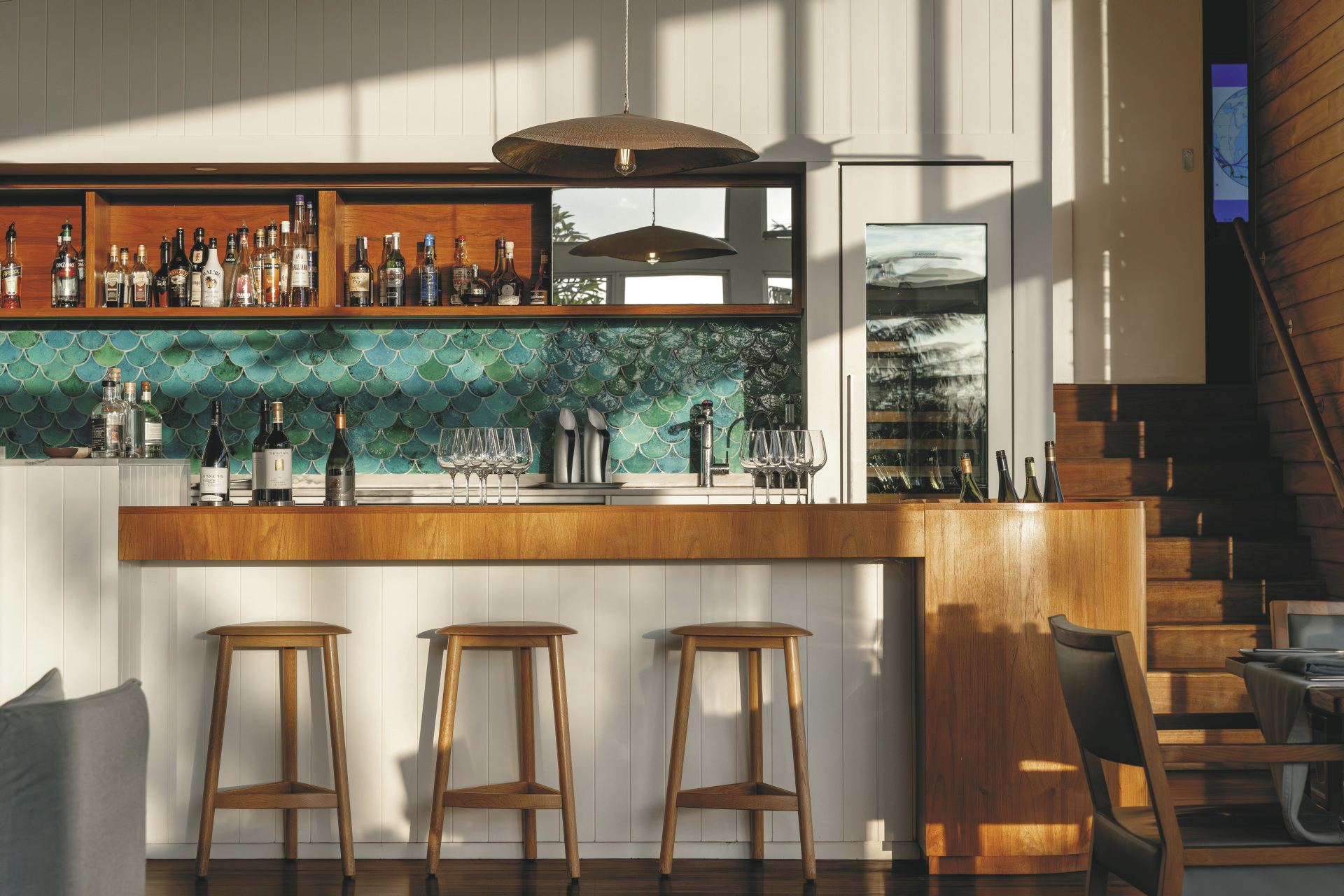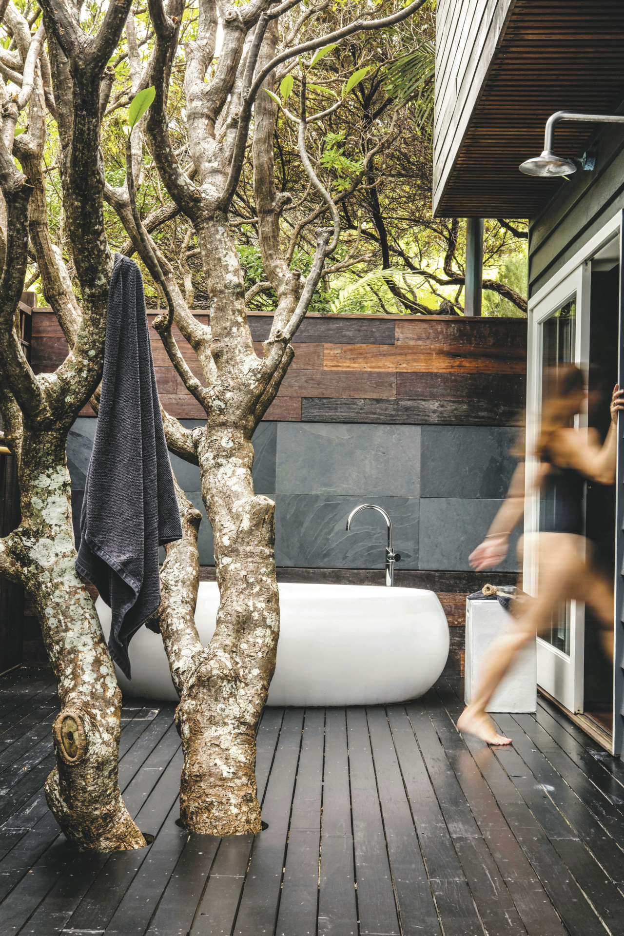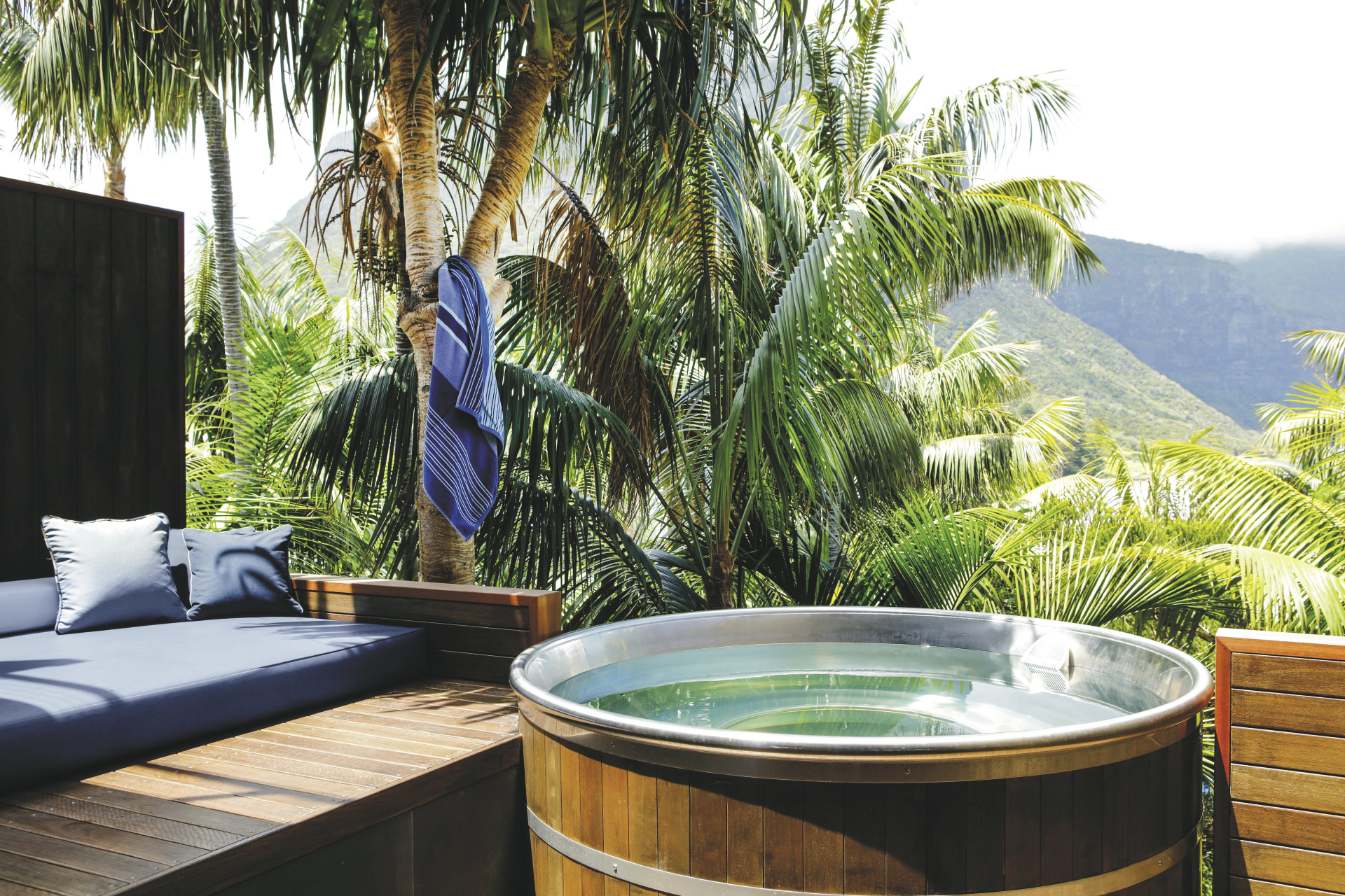 Der beeindruckende, 125 m² große Lidgbird Pavilion hat ebenfalls zwei Etagen. Von der Terrasse mit privatem Tauchbecken, Tagesbett, Regendusche und freistehender