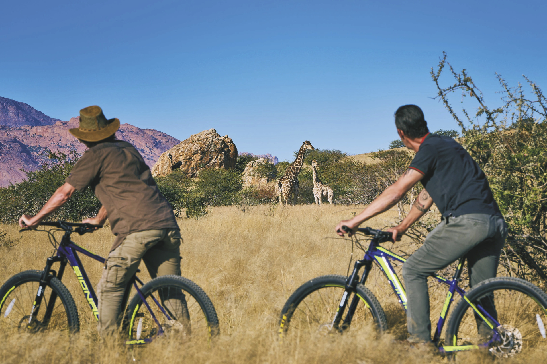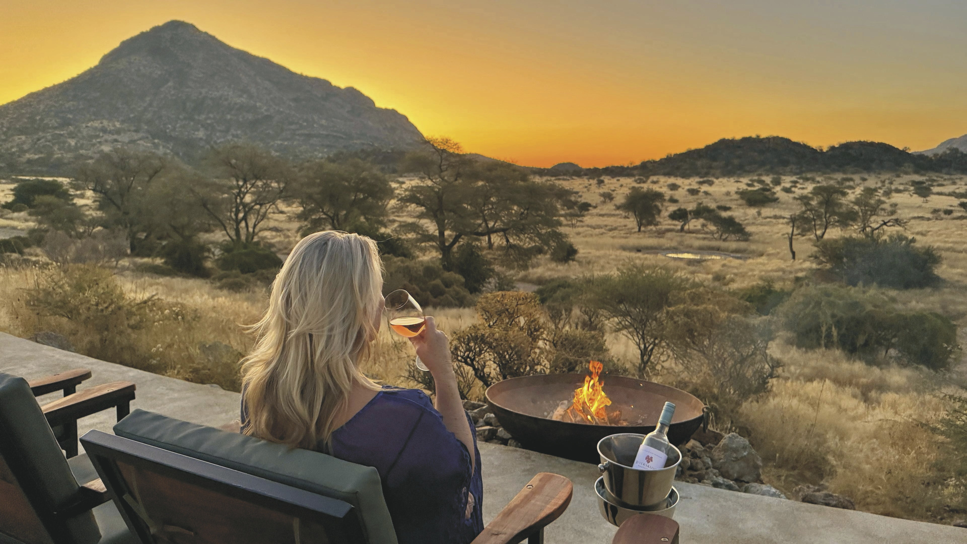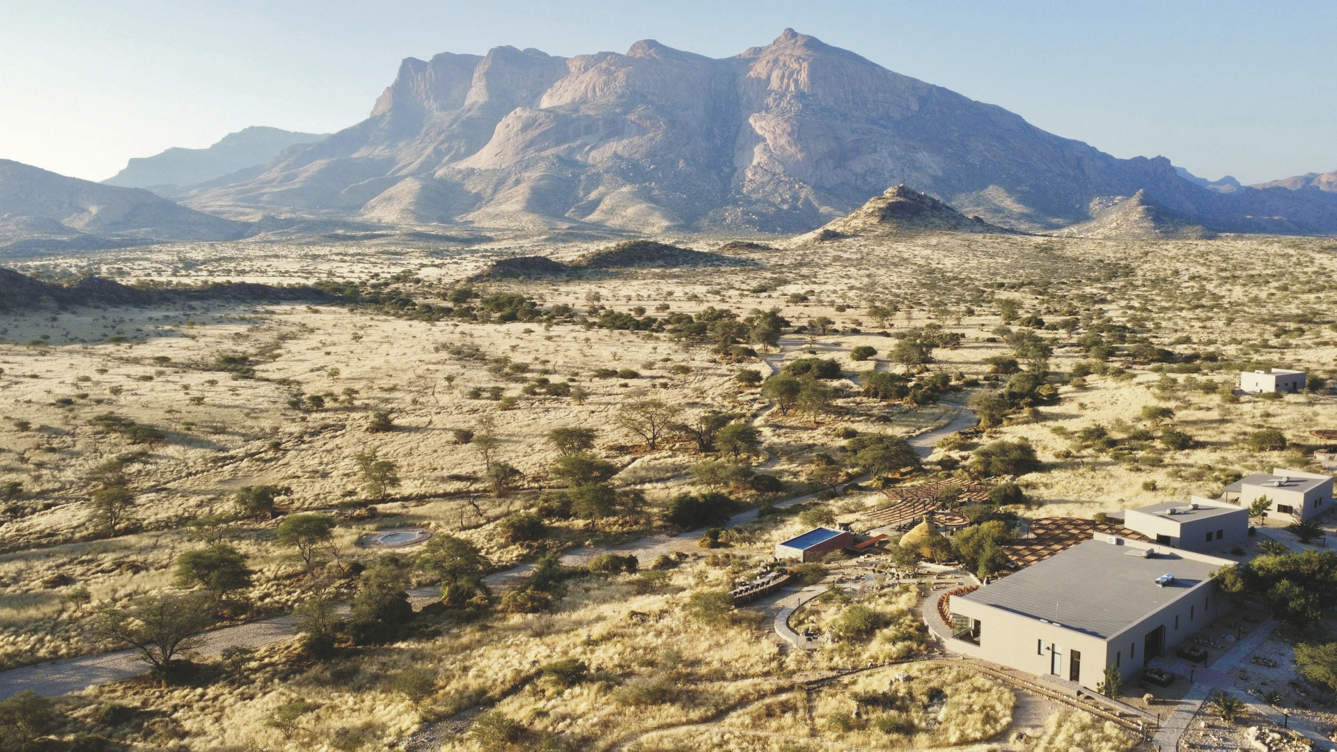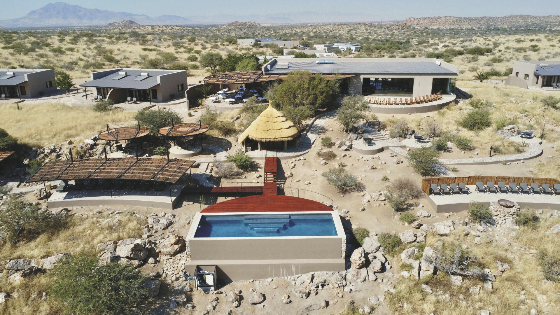Die Lodge liegt dem höchsten Gipfel des Erongogebirges zu Füßen. Spektakuläre Sonnenuntergänge lassen den Berg in fantastischem roten Licht erscheinen. Im Haupthaus befinden sich das Restaurant und ein kombinierter Lounge-/Barbereich mit Kamin und kostenlosem WLAN. Die Terrasse bietet ein großartiges Panorama und Blick auf das nahe Wasserloch. Auf der Sonnenterrasse am Pool können Sie abschalten und entspannen. Am Abend lässt es sich an der flackernden Feuerstelle gut über die Ereignisse des Tages austauschen. Philipps Cave mit seinen Felsmalereien und die Granitformationen von Bulls Party befinden sich gleich auf der Nachbarfarm. Optionale Aktivitäten: geführte Wanderungen, markierte Wanderwege, Panoramafahrten, Besuch der Felsmalereien, Mountain-Bike Verleih.