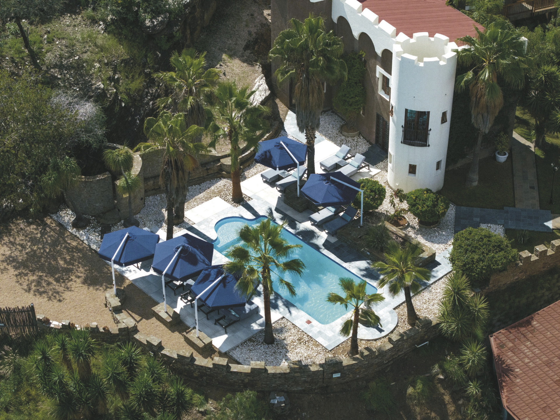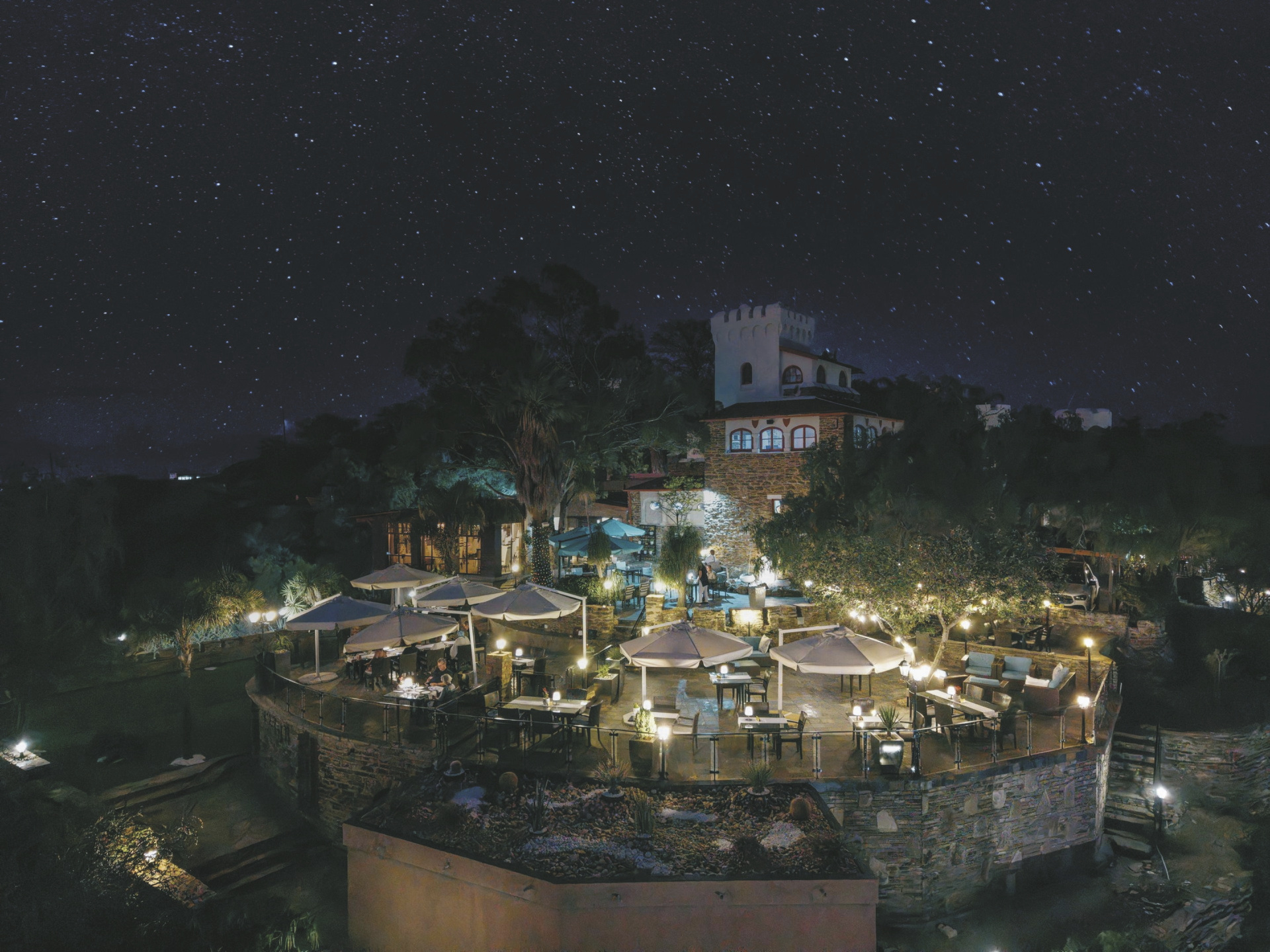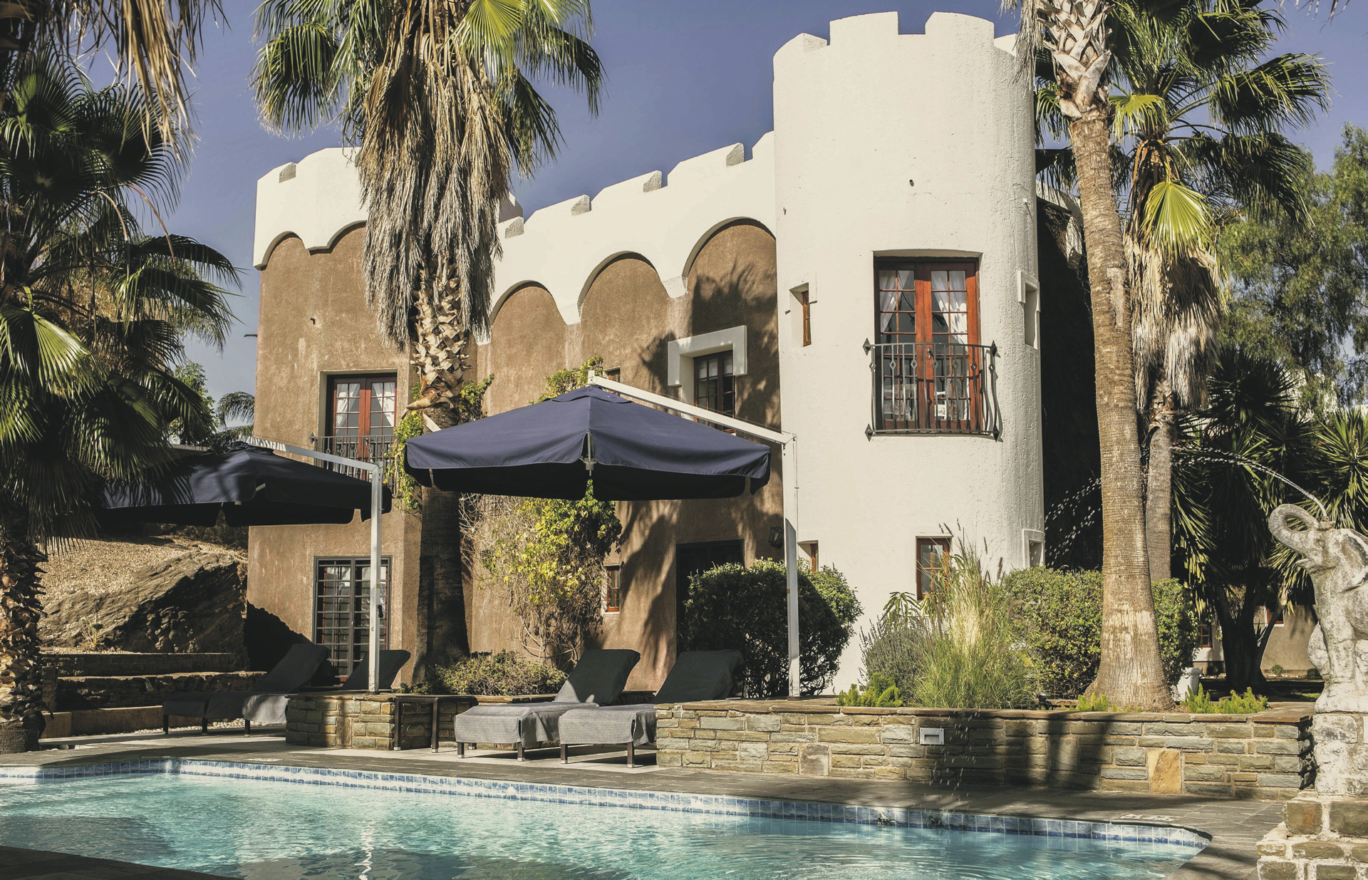 Das bereits 1914 vom Grafen von Schwerin für seine Verlobte erbaute Haus steht in Namibia für hervorragenden Service und kulinarische Genüsse. Das Top Gourmet-Restaurant Leo‘s at the Castle verfügt über den größten privaten Felsen-Weinkeller des Landes und ist längst kein Geheimtipp mehr. Private Abendessen können Sie auch im Ritterraum einnehmen. Von der Terrasse hat man einen herrlichen Blick über die Stadt. Ein beheizbarer Pool mit Sonnenliegen verspricht ebenso Entspannung, wie eine optionale Massage, die Sie in Ihrem Zimmer genießen können. Kostenloses WLAN und bewachter Parkplatz stehen selbstverständlich zur Verfügung.