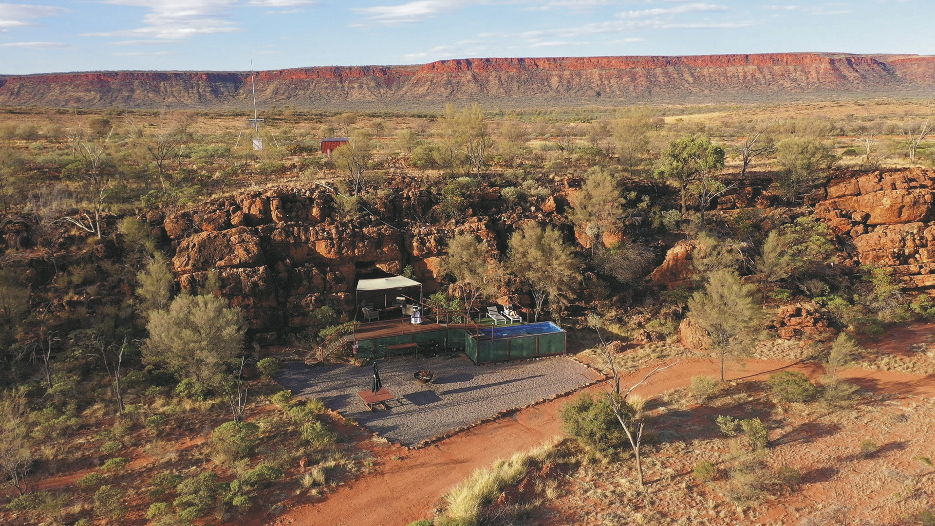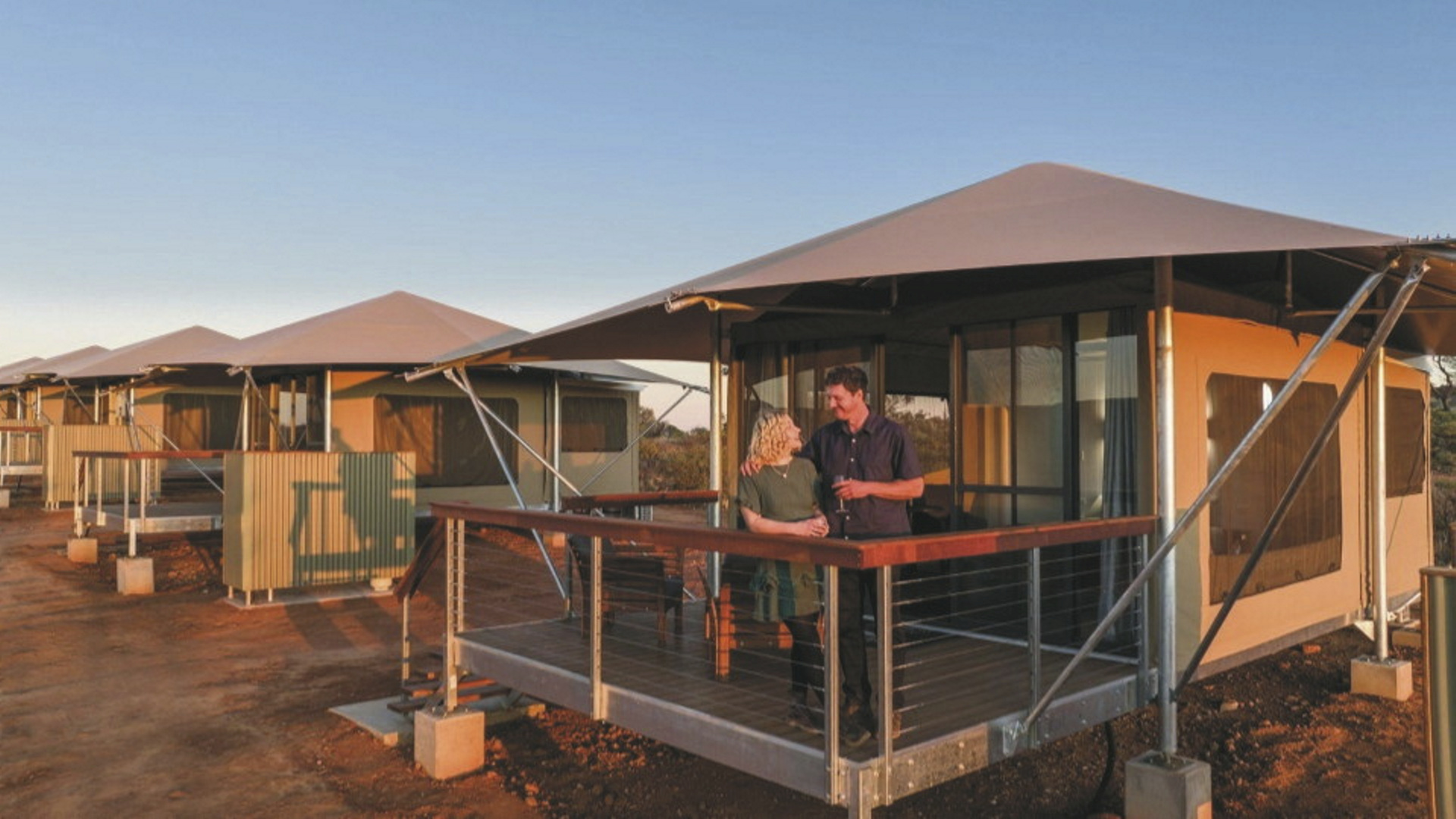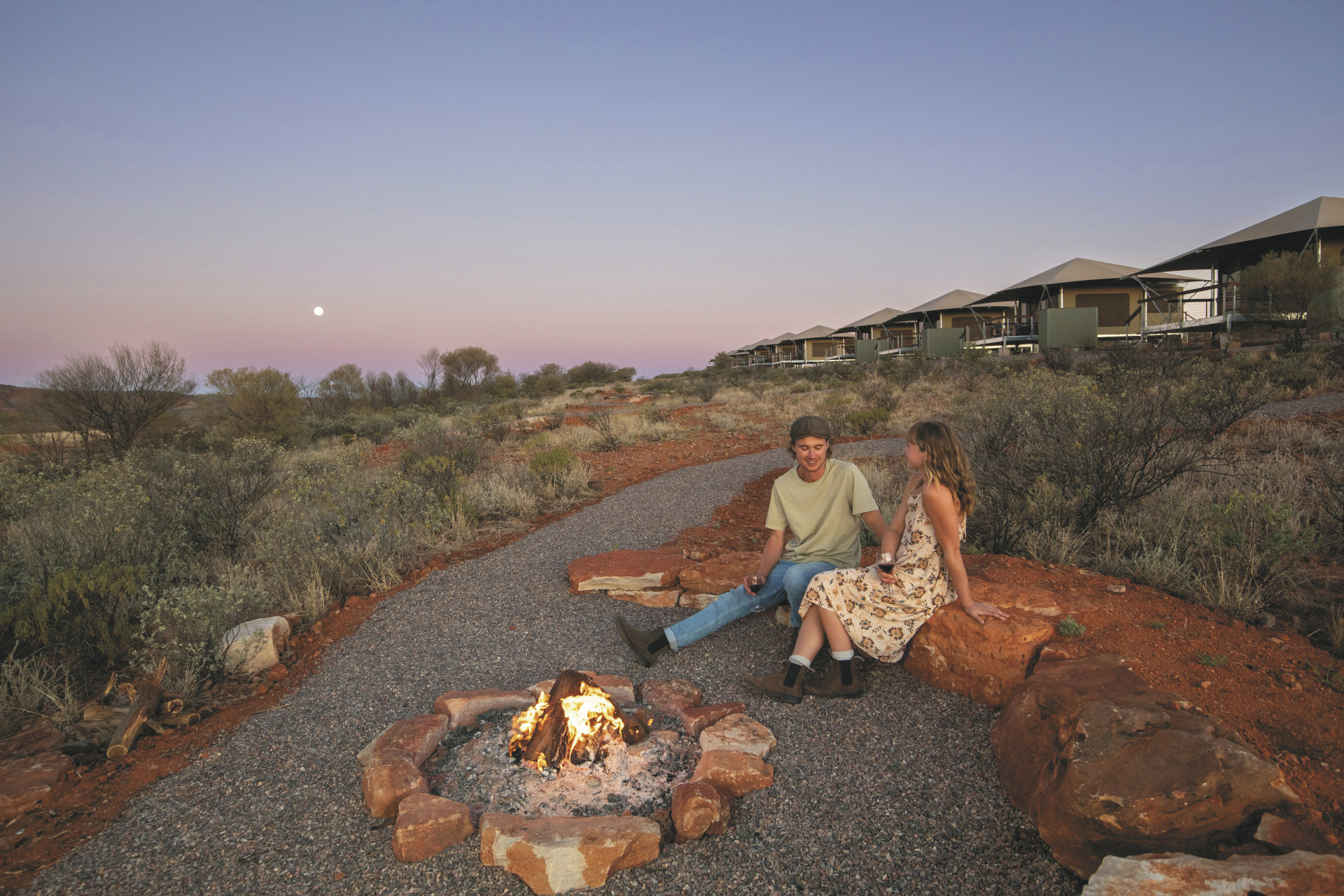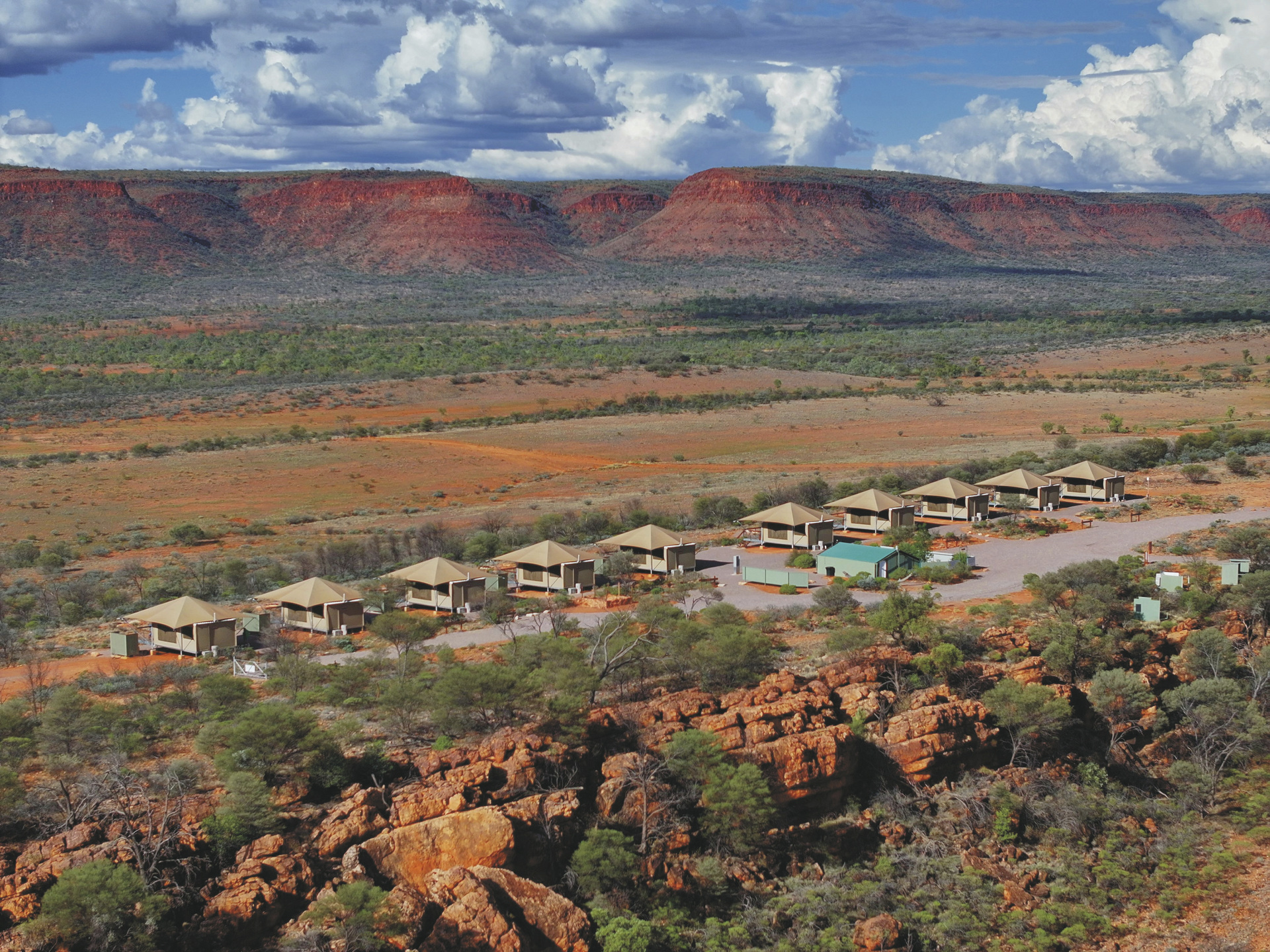 Die Anlage bietet verschiedene Unterkunftsoptionen, darunter die höherwertigen Kategorien Drovers Dream und Dreamtime Escarpment. Drovers Dream umfasst 10 Bungalow-Zelte in ruhiger Lage mit Blick auf die umliegende Landschaft. Zur Ausstattung zählen u.a. eigenes Bad mit Dusche, Queensize-Bett, Klimaanlage sowie eine private Terrasse mit BBQ. Weiterhin gibt es eine gemeinsame Feuerstelle.Die größeren und komfortabler ausgestatteten Dreamtime Escarpment-Zelte liegen erhöht entlang eines Felsrands in abgeschiedener Lage (ca. 7 km von der Rezeption und dem Cafe entfernt; 4WD-Fahrzeug empfohlen) und bieten mehr Privatsphäre, weite Ausblicke sowie gute Luftzirkulation. Sie verfügen u.a. über ein eigenes Bad mit Outdoor-Dusche, Kingsize-Bett oder zwei Einzelbetten, hochwertige Bettwäsche, Bademäntel und Slipper, Klimaanlage, Heizung, Stromanschluss und Kaffeezubereiter. Ergänzt wird die Ausstattung durch eine private Außenfläche mit Sitzmöglichkeiten und Feuerstelle. Gäste erhalten zusätzlich ein Verpflegungspaket mit BBQ-Dinner und Frühstück zur Selbstzubereitung. Ein Poolbereich steht ebenfalls zur Verfügung.