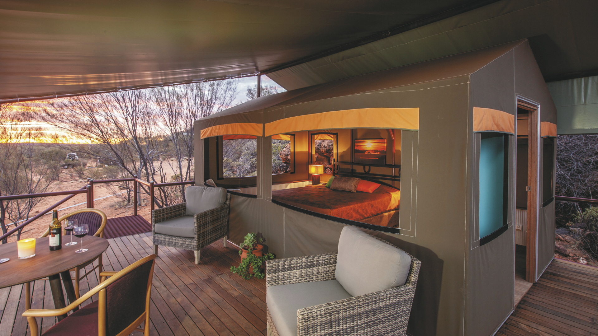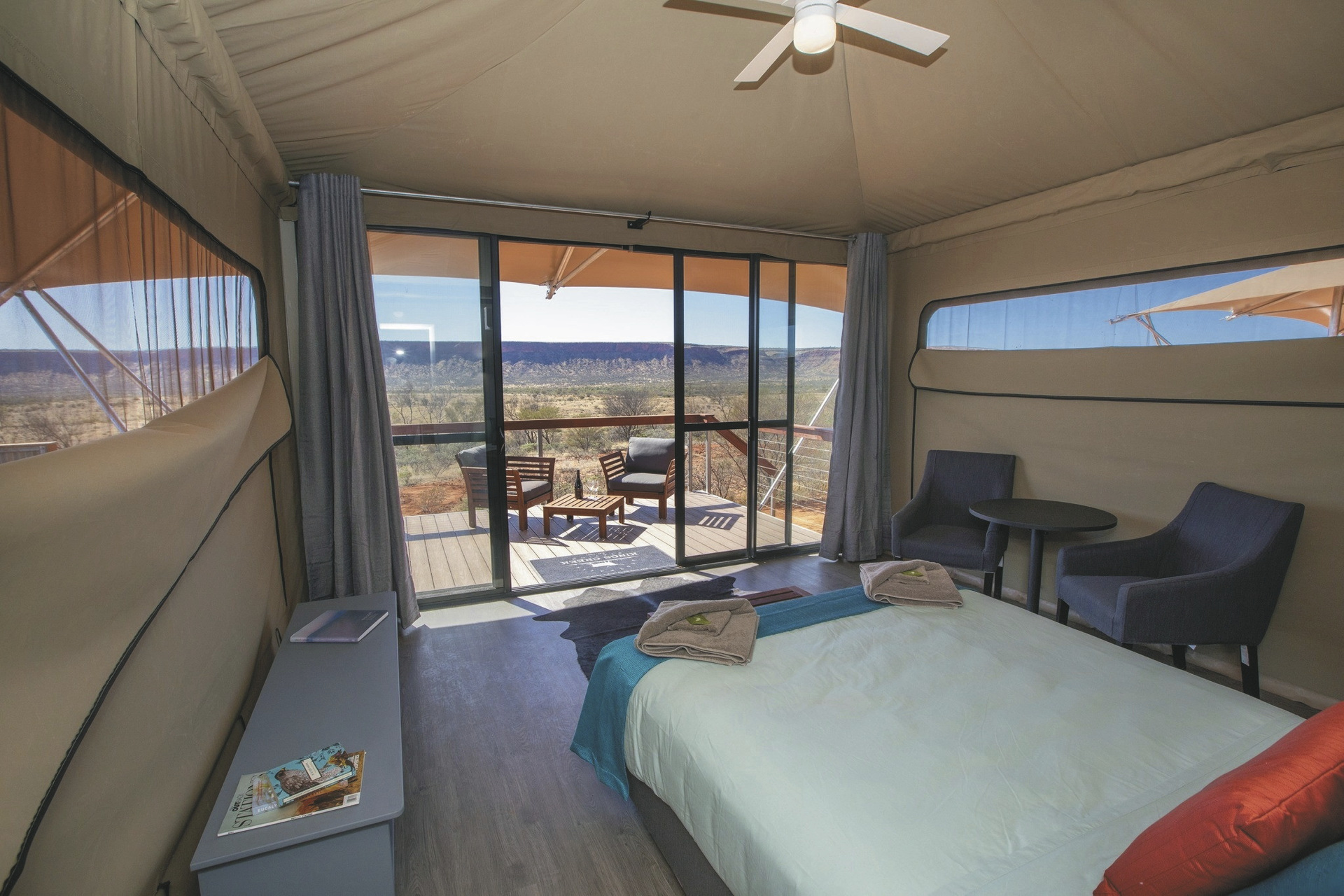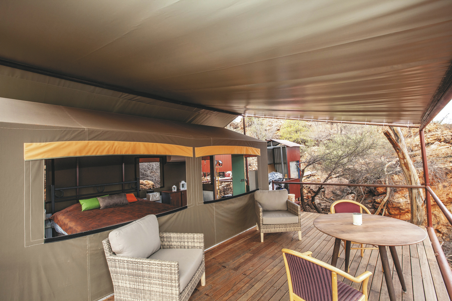 Die Anlage bietet verschiedene Unterkunftsoptionen, darunter die höherwertigen Kategorien Drovers Dream und Dreamtime Escarpment. Drovers Dream umfasst 10 Bungalow-Zelte in ruhiger Lage mit Blick auf die umliegende Landschaft. Zur Ausstattung zählen u.a. eigenes Bad mit Dusche, Queensize-Bett, Klimaanlage sowie eine private Terrasse mit BBQ. Weiterhin gibt es eine gemeinsame Feuerstelle.Die größeren und komfortabler ausgestatteten Dreamtime Escarpment-Zelte liegen erhöht entlang eines Felsrands in abgeschiedener Lage (ca. 7 km von der Rezeption und dem Cafe entfernt; 4WD-Fahrzeug empfohlen) und bieten mehr Privatsphäre, weite Ausblicke sowie gute Luftzirkulation. Sie verfügen u.a. über ein eigenes Bad mit Outdoor-Dusche, Kingsize-Bett oder zwei Einzelbetten, hochwertige Bettwäsche, Bademäntel und Slipper, Klimaanlage, Heizung, Stromanschluss und Kaffeezubereiter. Ergänzt wird die Ausstattung durch eine private Außenfläche mit Sitzmöglichkeiten und Feuerstelle. Gäste erhalten zusätzlich ein Verpflegungspaket mit BBQ-Dinner und Frühstück zur Selbstzubereitung. Ein Poolbereich steht ebenfalls zur Verfügung.
