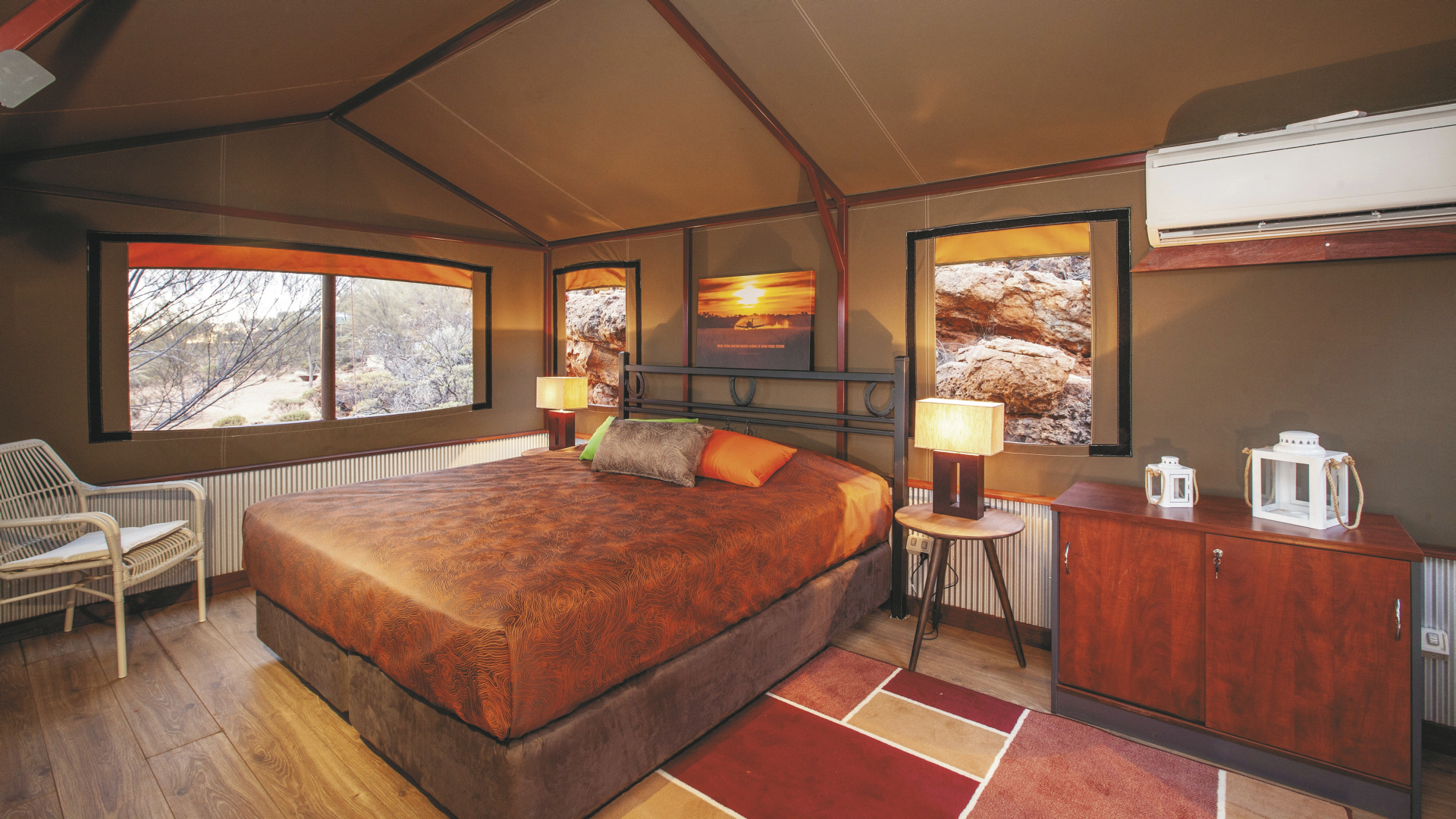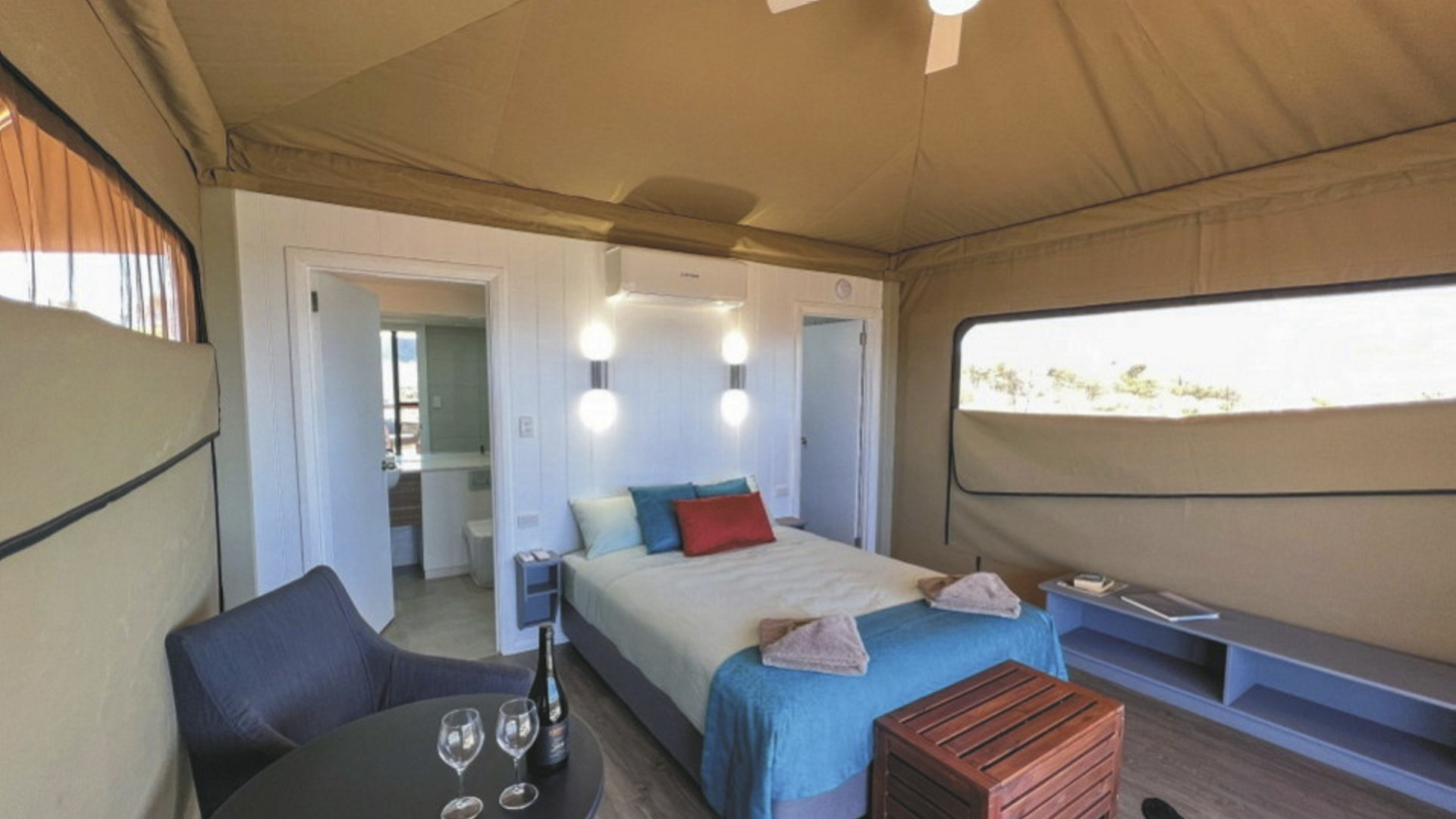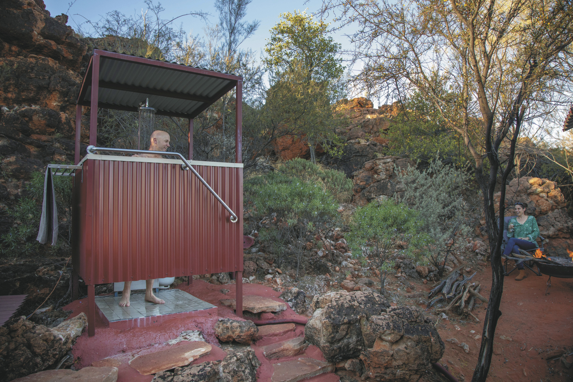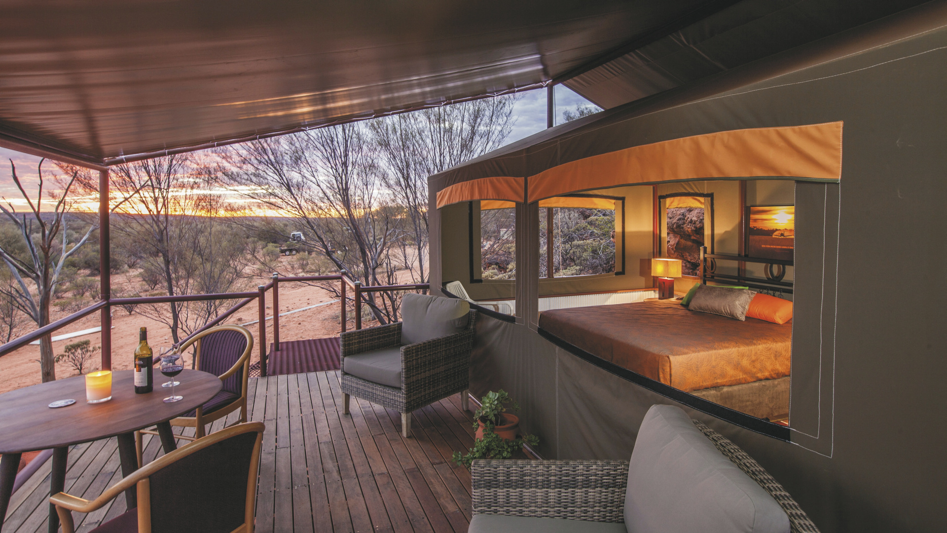 Die Anlage bietet verschiedene Unterkunftsoptionen, darunter die höherwertigen Kategorien Drovers Dream und Dreamtime Escarpment. Drovers Dream umfasst 10 Bungalow-Zelte in ruhiger Lage mit Blick auf die umliegende Landschaft. Zur Ausstattung zählen u.a. eigenes Bad mit Dusche, Queensize-Bett, Klimaanlage sowie eine private Terrasse mit BBQ. Weiterhin gibt es eine gemeinsame Feuerstelle.Die größeren und komfortabler ausgestatteten Dreamtime Escarpment-Zelte liegen erhöht entlang eines Felsrands in abgeschiedener Lage (ca. 7 km von der Rezeption und dem Cafe entfernt; 4WD-Fahrzeug empfohlen) und bieten mehr Privatsphäre, weite Ausblicke sowie gute Luftzirkulation. Sie verfügen u.a. über ein eigenes Bad mit Outdoor-Dusche, Kingsize-Bett oder zwei Einzelbetten, hochwertige Bettwäsche, Bademäntel und Slipper, Klimaanlage, Heizung, Stromanschluss und Kaffeezubereiter. Ergänzt wird die Ausstattung durch eine private Außenfläche mit Sitzmöglichkeiten und Feuerstelle. Gäste erhalten zusätzlich ein Verpflegungspaket mit BBQ-Dinner und Frühstück zur Selbstzubereitung. Ein Poolbereich steht ebenfalls zur Verfügung.