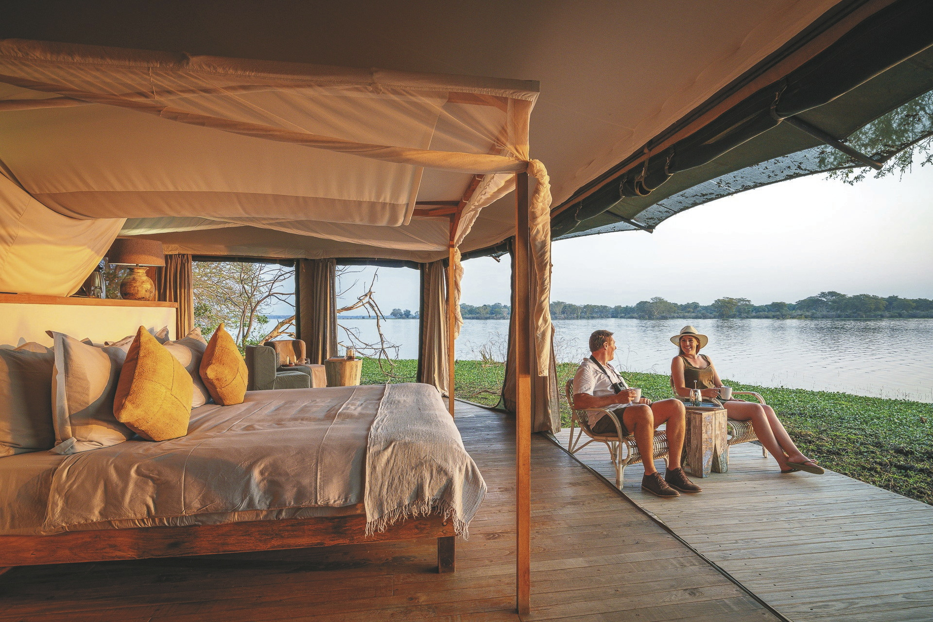 Ebenfalls ganz nah am Flussufer befinden sich die 5 großen, modernen Safarizelte. Jedes verfügt über ein eigenes offenes Bad mit Außendusche; Moskitonetz, Loungebereich und Terrasse mit herrlicher Aussicht über die Flusslandschaft. Das Bett ist mit einem Evening Breeze System ausgestattet, das effizient nur das Bett, jedoch nicht das komplette Zelt am Abend kühlt. Für den Kontakt zu den Lieben nach Hause finden Sie in Ihrem Zelt auch kostenfreies WLAN. Für Familien gibt es die Möglichkeit Kinder auf zwei Zustellbetten im Zimmer unterzubringen.