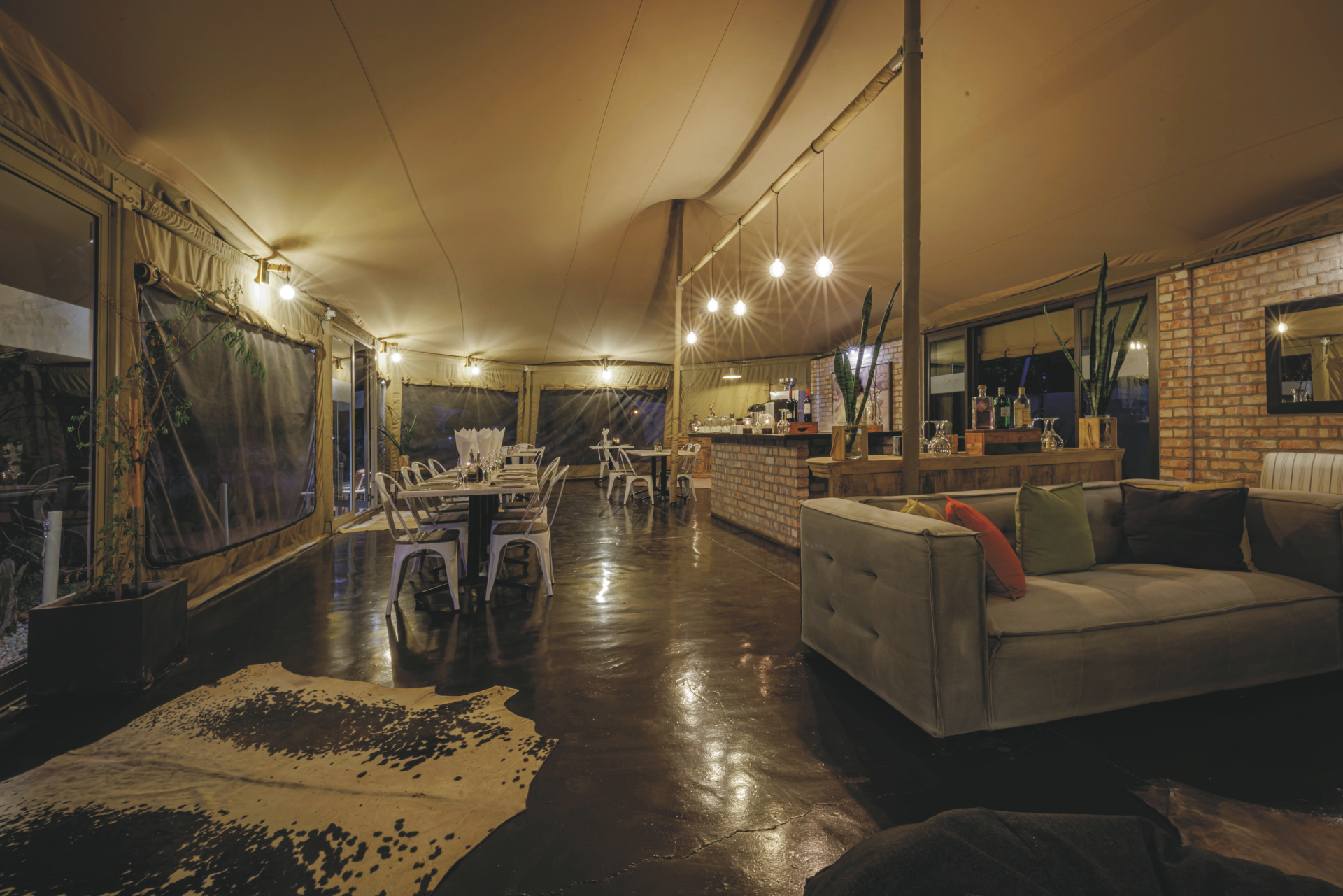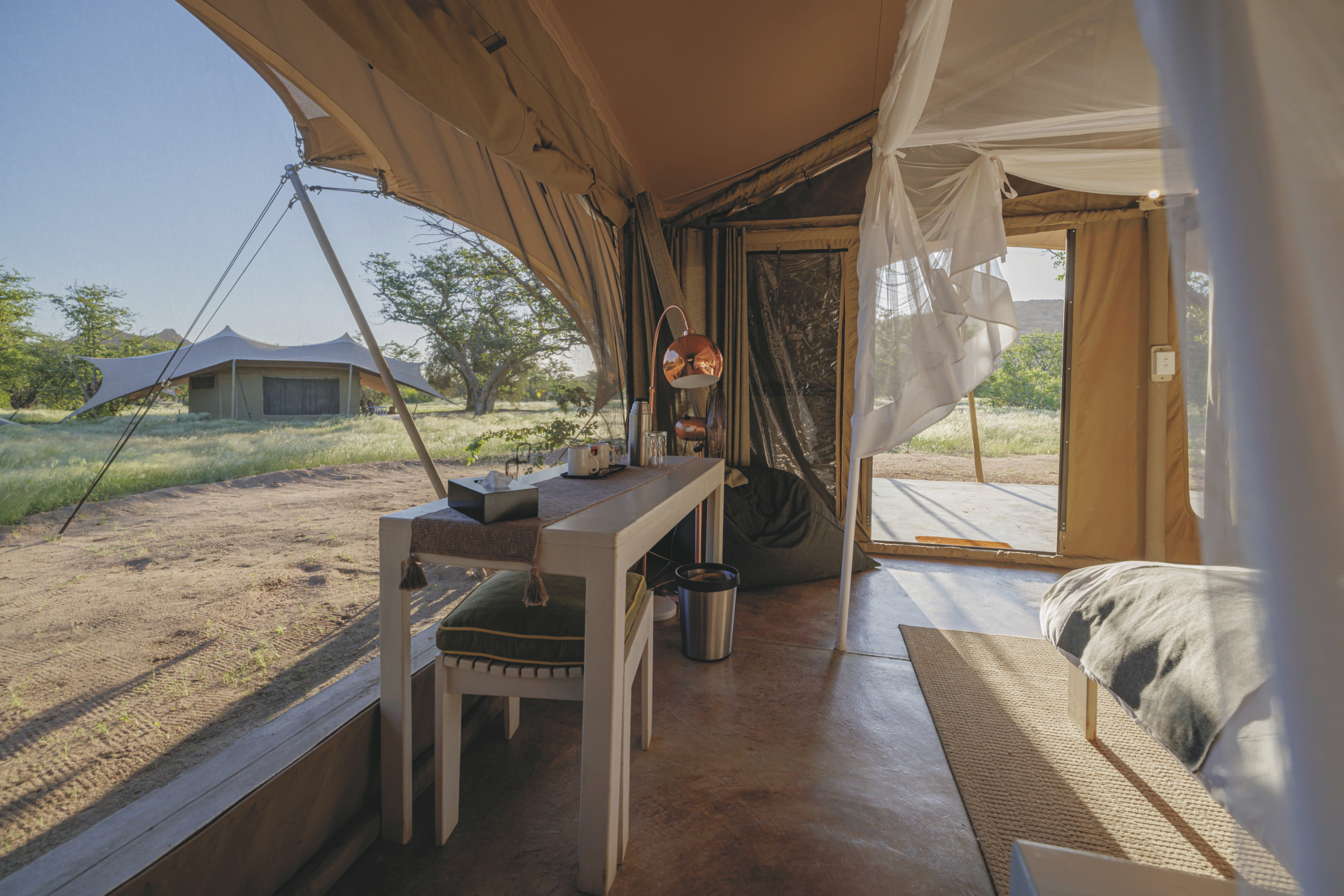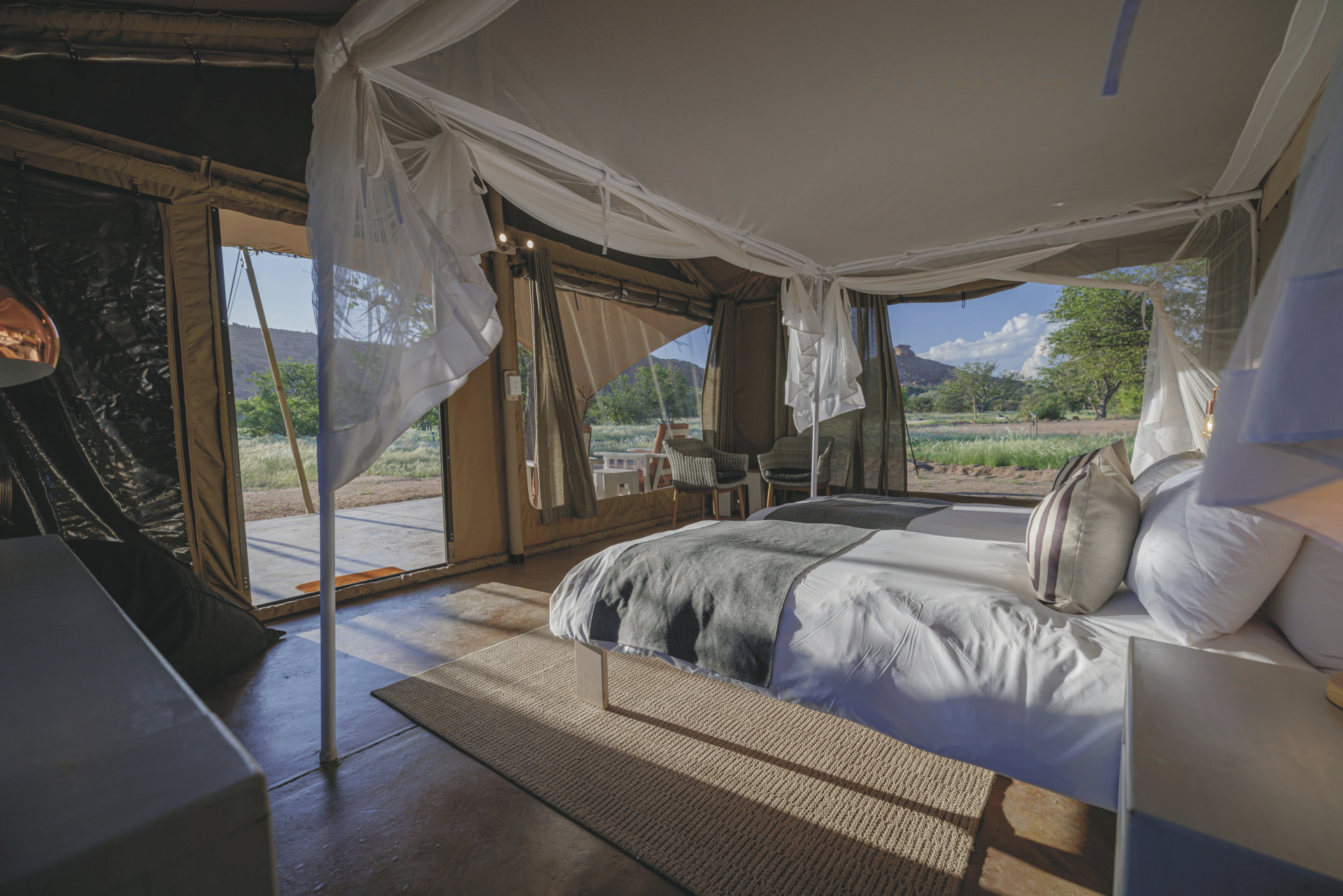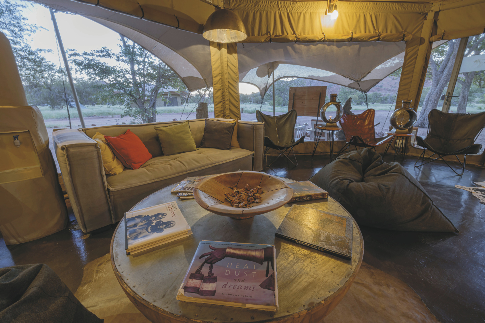 Dieses Camp verbindet im Design ein Hauch von Abenteuer mit komfortabler Gemütlichkeit. Hell, luftig und afrikanisch kommt das Interieur daher.
