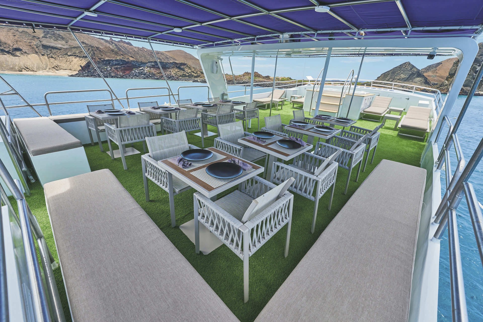 Bartolome - Plaza - Santa Fe (F/M/A).Landen Sie am Morgen an der South Plaza Insel, um Wildtiere zu beobachten und einen Spaziergang durch den Kaktuswald zu machen. Am Nachmittag unternehmen Sie einen geführten Spaziergang durch Santa Fé, um die Wildtiere und zahlreiche Meeresleguane zu beobachten.