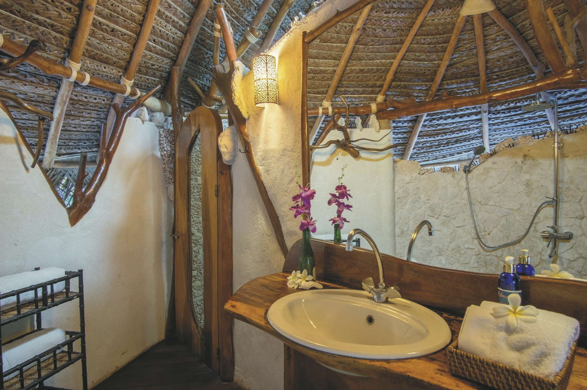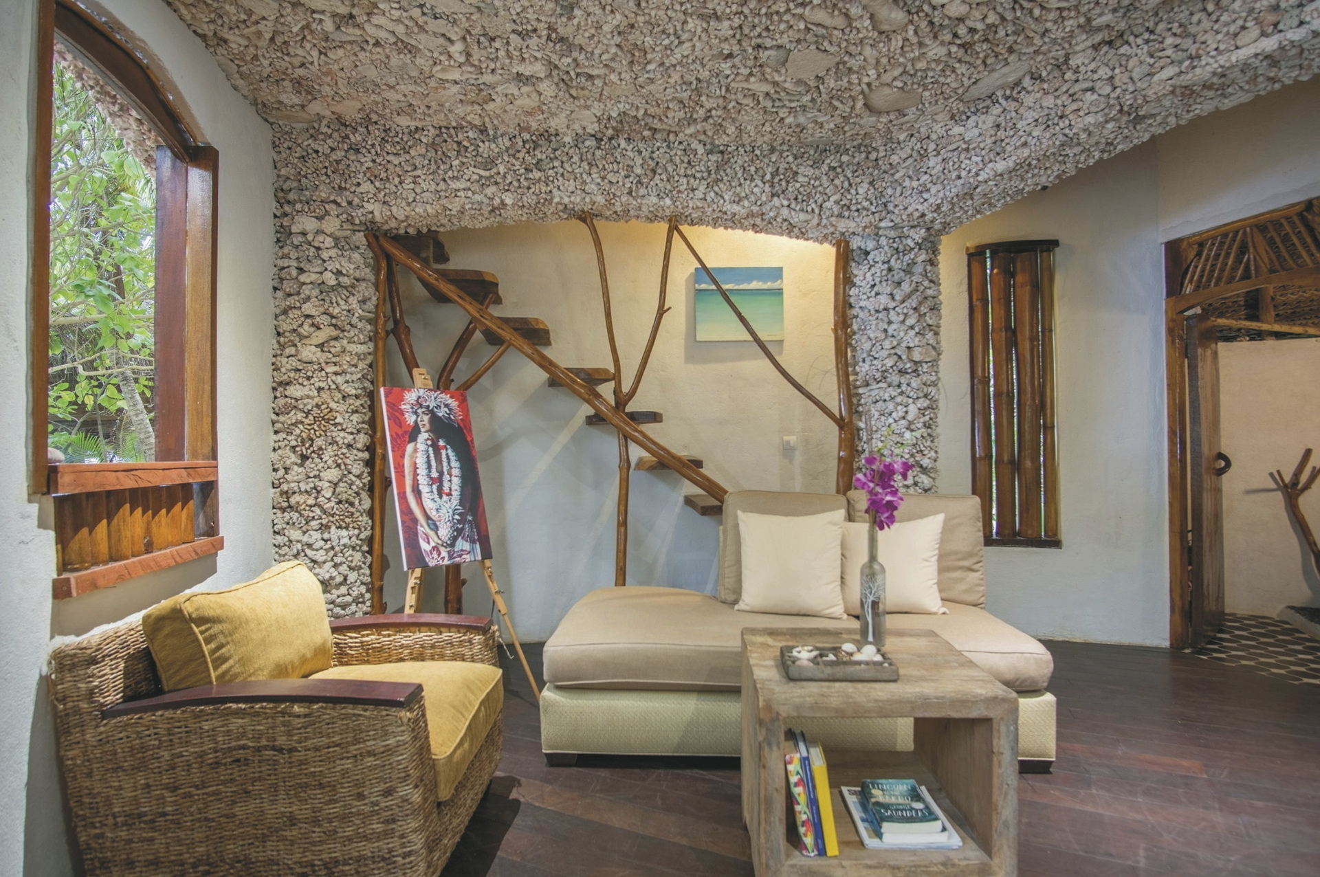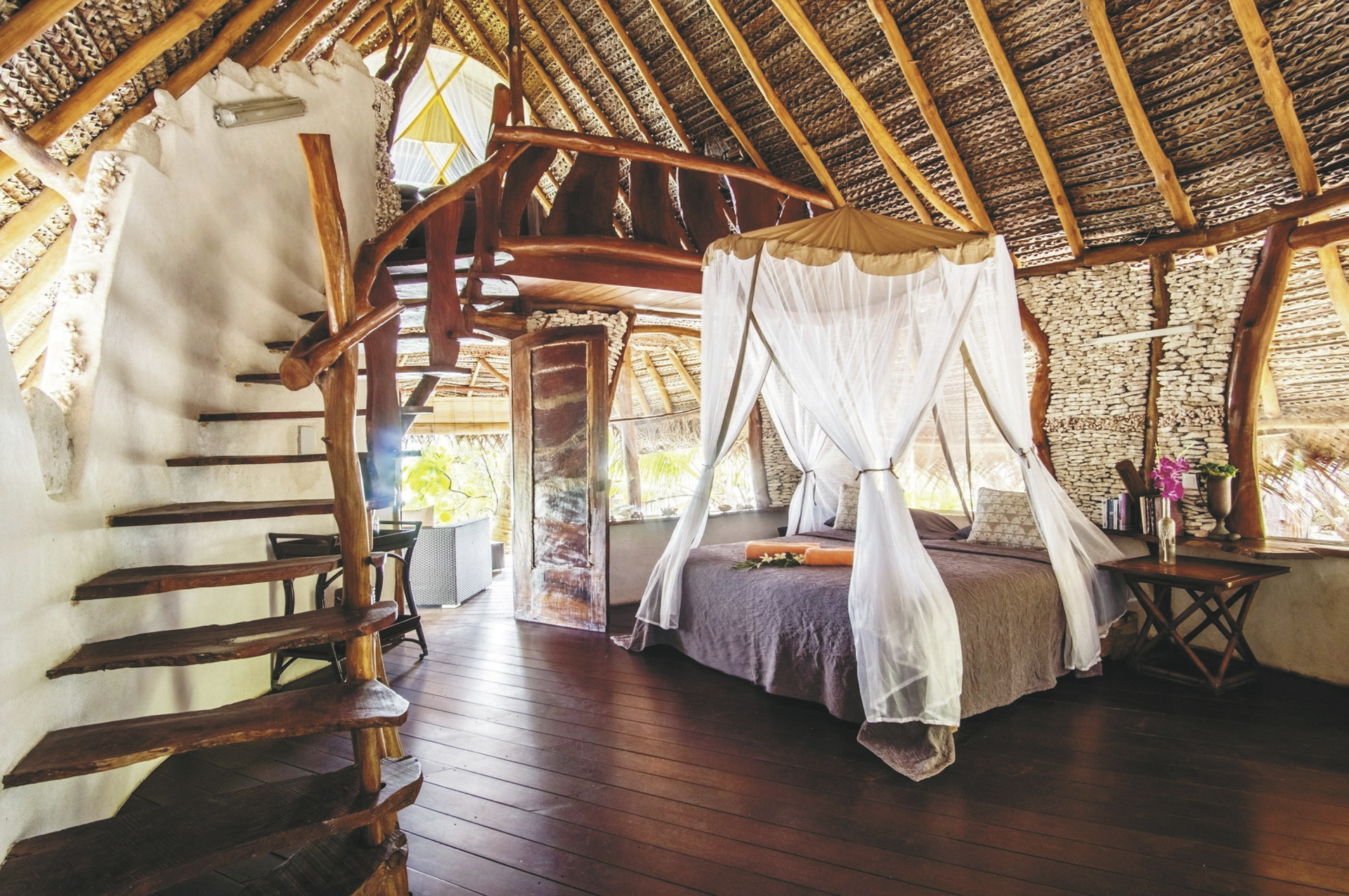 8 Bungalows im Garten oder am Meer aus natürlichen Materialien wie Korallen und Palmwedeln, ausgestattet mit Ventilator, MP3-Dock, Moskitonetz.