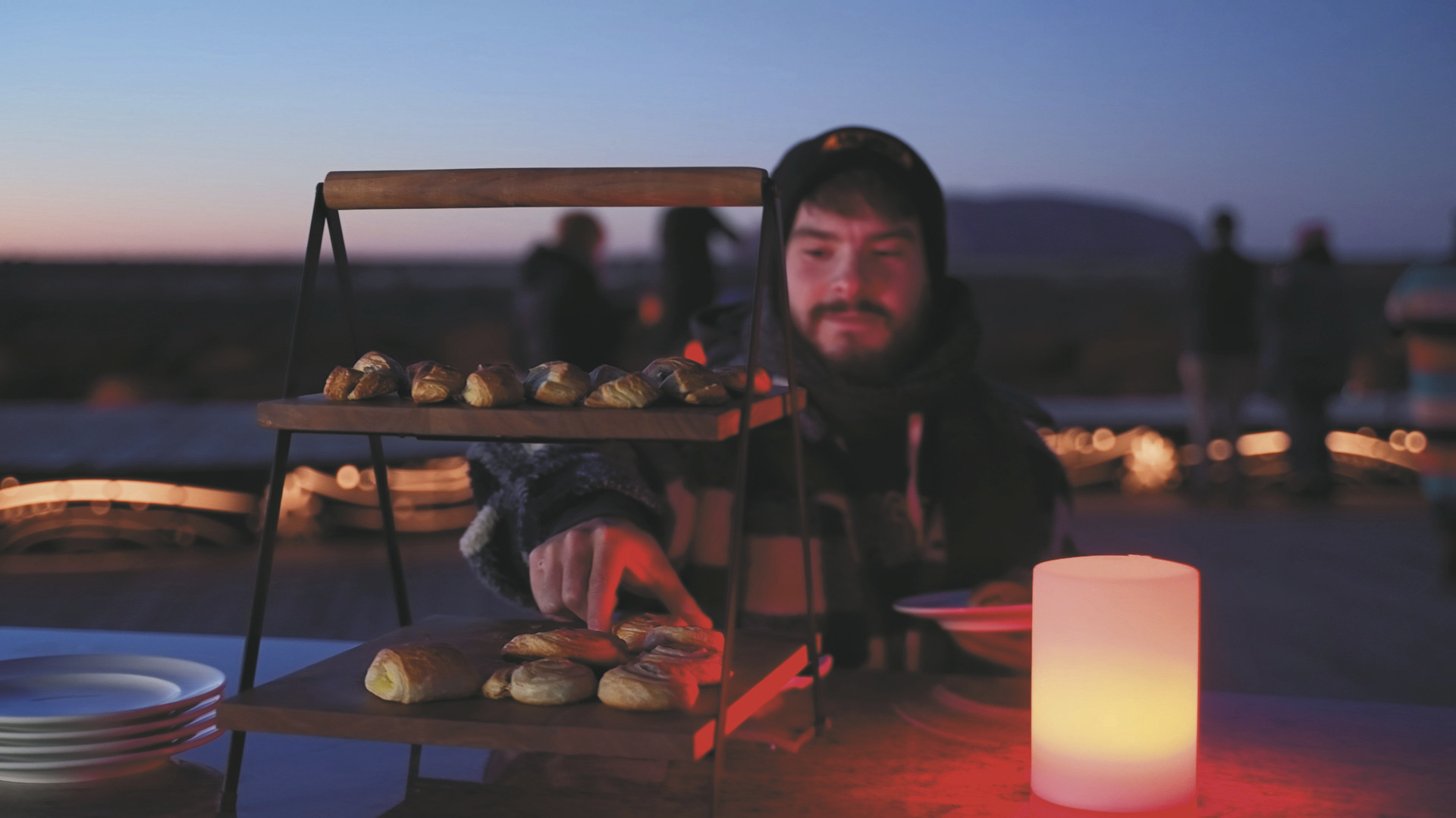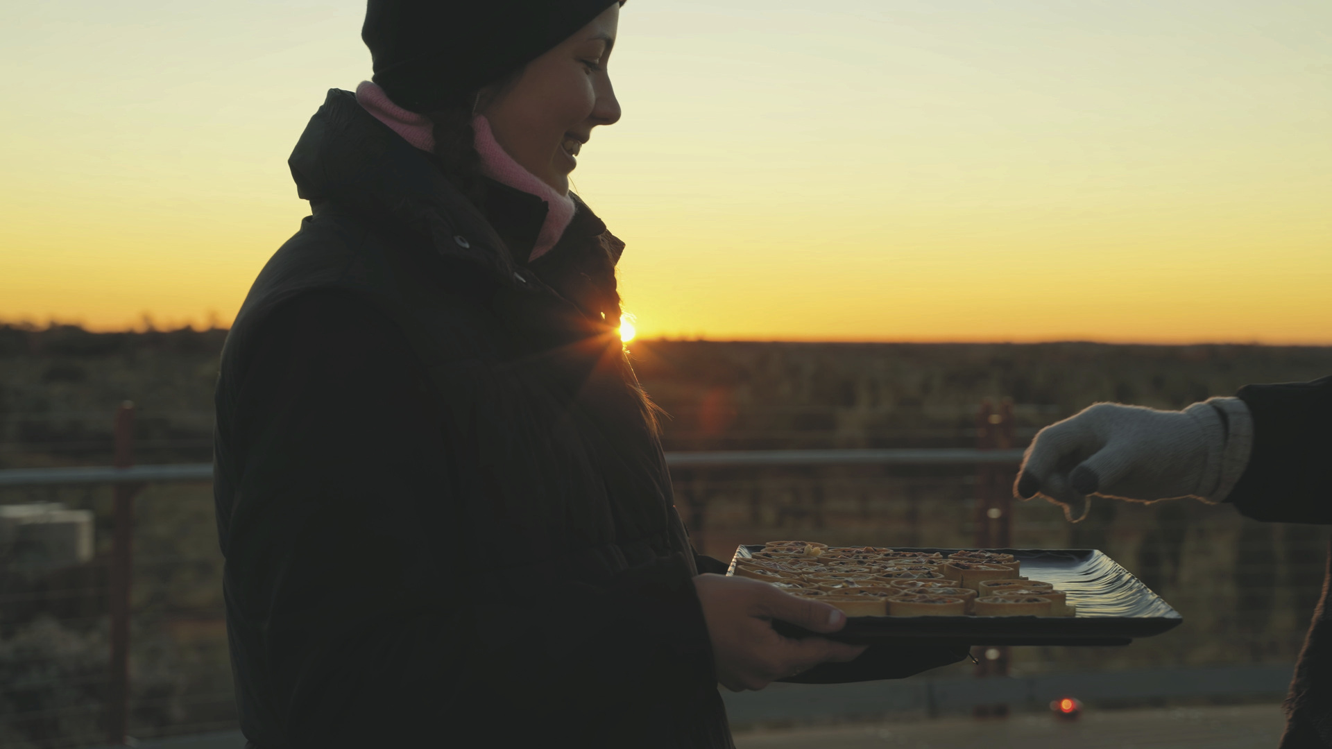 Sunrise Journeys rückt drei produktive Anangu-Künstlerinnen ins Rampenlicht, die sich zusammengetan haben, um ein maßgeschneidertes Kunstwerk zu schaffen, das ihre tiefe Verbindung zur Kultur und zum Land darstellt. Bevor sich die leuchtenden Silhouetten von Uluru und Kata Tjuta offenbaren, wird das Kunstwerk zum Leben erweckt, wobei die weite Wüstenlandschaft als natürliche Leinwand genutzt wird.Während sich die rote Erde unter der aufgehenden Sonne erwärmt, nehmen die Gäste auf der nachhaltig gebauten Plattform mit Blick auf Uluru und Kata Tjuta Platz und beobachten, wie das Kunstwerk mit modernster Laser- und Lichtprojektionstechnologie auf der weiten, dunklen Wüstenlandschaft darunter nachgebildet wird. Indigene Symbolik – ähnlich wie sie häufig in Punktmalereien zu sehen ist – beginnt sanft über das Land zu fließen.