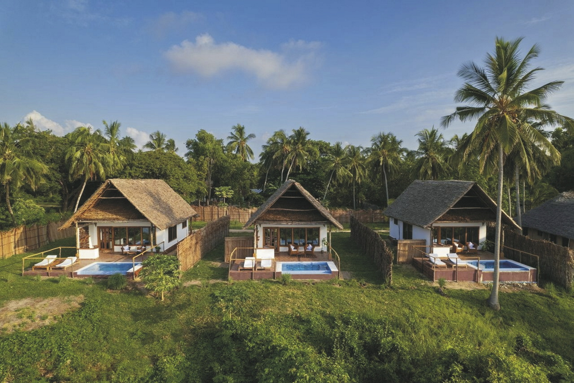 Inmitten von Kokospalmen mit Blick auf die Chloe Bay liegen die 12 geräumigen Bungalows und Suiten. Sie verfügen über ein Bad mit Dusche/WC, Klimaanlage, Deckenventilator und eine Veranda mit Tagesbett. Die Suiten sind größer und haben einen eigenen Plunge Pool. Die Alfajiri und Alasiri Suiten liegen direkt am Strand.
