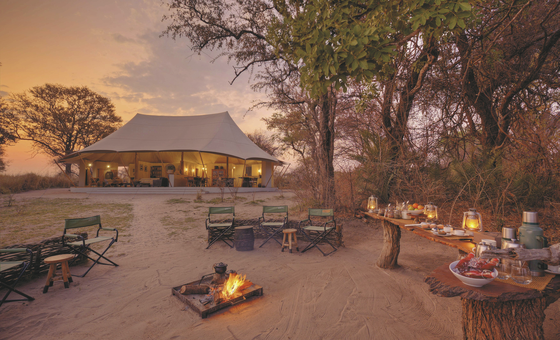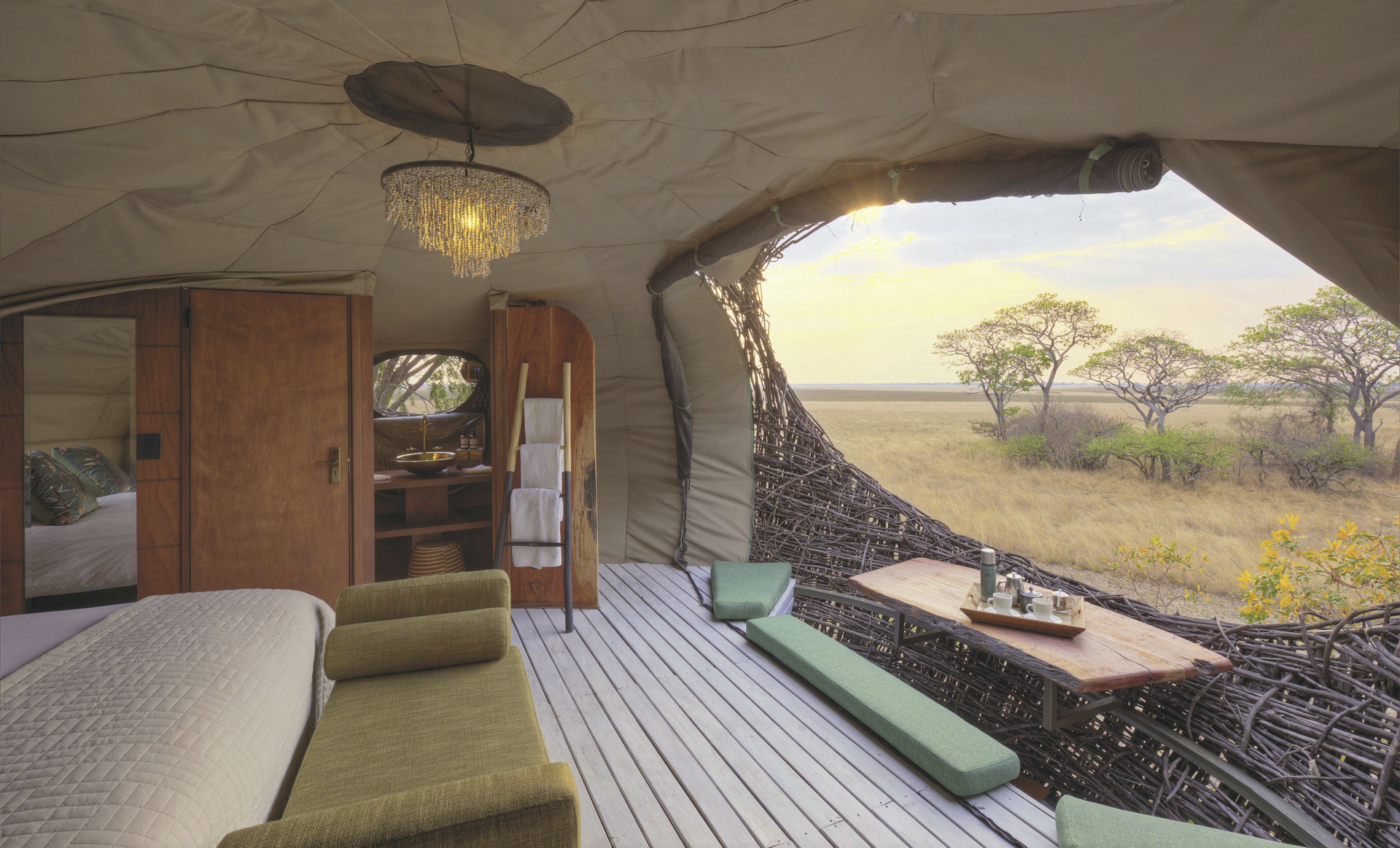Die sogenannten „Vogelnester“ sind luxuriöse Zeltunterkünfte, die vier Meter über dem Boden thronen und einen weiten Blick über die Busanga Plains bieten. Jedes Nest verfügt über ein eigenes Bad mit Dusche, Einzelwaschbecken und separater Toilette sowie Moskitonetzen und Ventilator. Die Ausstattung ist schlicht und funktional, mit liebevollen Details wie gefiltertem Kaffee und Tee sowie solarbetriebener Stromversorgung. Ein Nest ist barrierefrei und mit einem elektrischen Lift ausgestattet