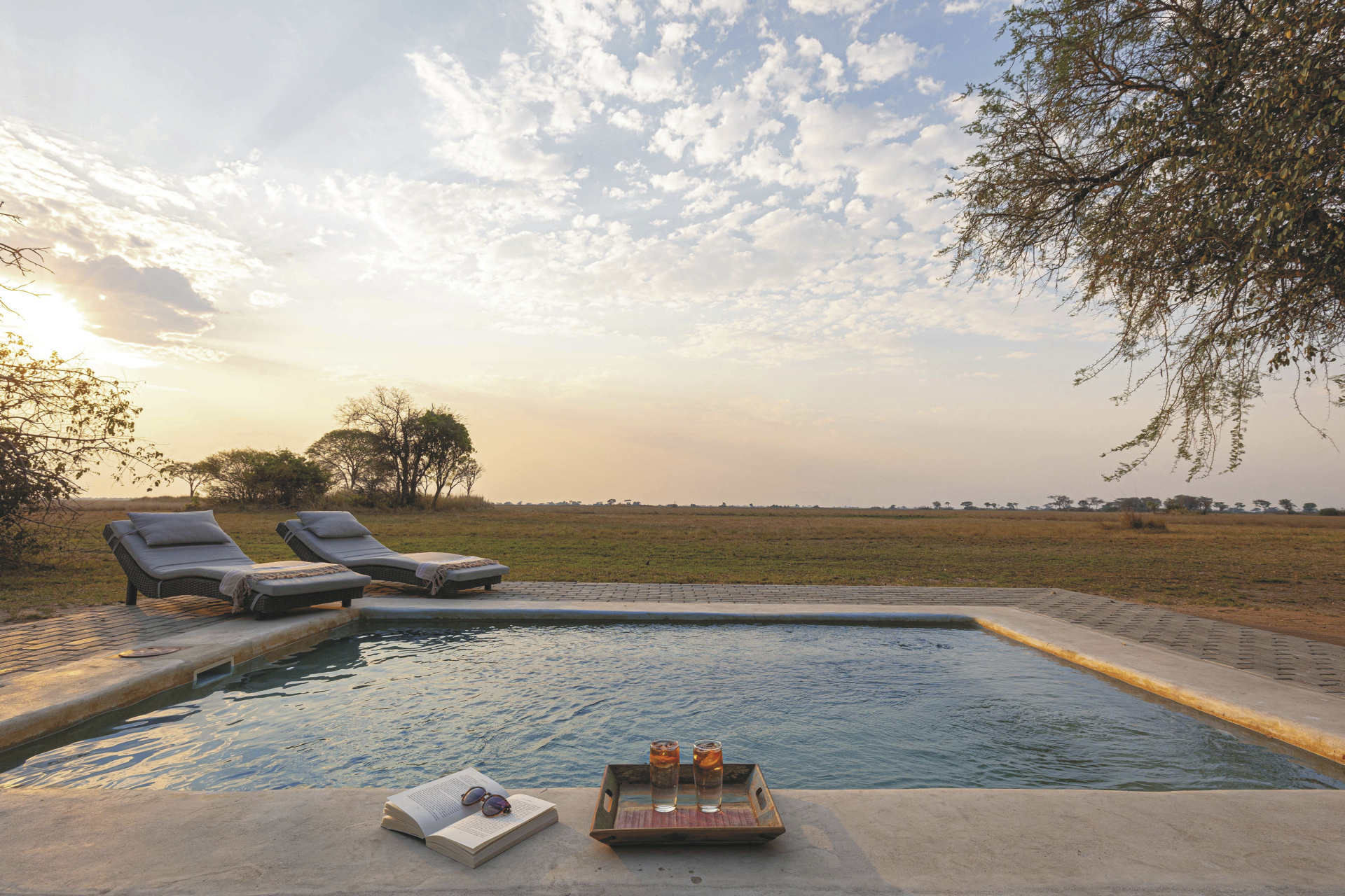 Der Hauptbereich des Camps umfasst eine offene Lounge, einen Essbereich und einen kleinen Pool mit Blick auf die Ebenen. Die Architektur ist inspiriert von Webervogelnestern und fügt sich harmonisch in die Landschaft ein. Die Atmosphäre ist ruhig und naturnah, ideal für Gäste, die sich ganz auf die Wildnis einlassen möchten. Besonders hervorzuheben sind die lautlosen Safaris mit elektrisch betriebenen Geländewagen, die ein intensives Naturerlebnis ermöglichen.Eingeschlossene Leistungen: Pirschfahrten, Buschwanderungen.