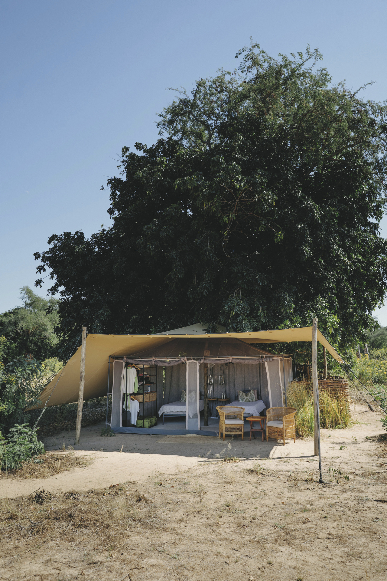 Die sechs Safarizelte sind großzügig und offen gestaltet, sodass Sie die Geräusche der Natur hautnah erleben. Jedes Zelt verfügt über ein eigenes Badezimmer mit Eimerdusche, Waschbecken und Toilette. Ventilatoren und Stromanschlüsse sind vorhanden, die Ausstattung ist schlicht und funktional. Von Ihrer privaten Veranda aus genießen Sie einen direkten Blick auf den Fluss und die vorbeiziehende Tierwelt.