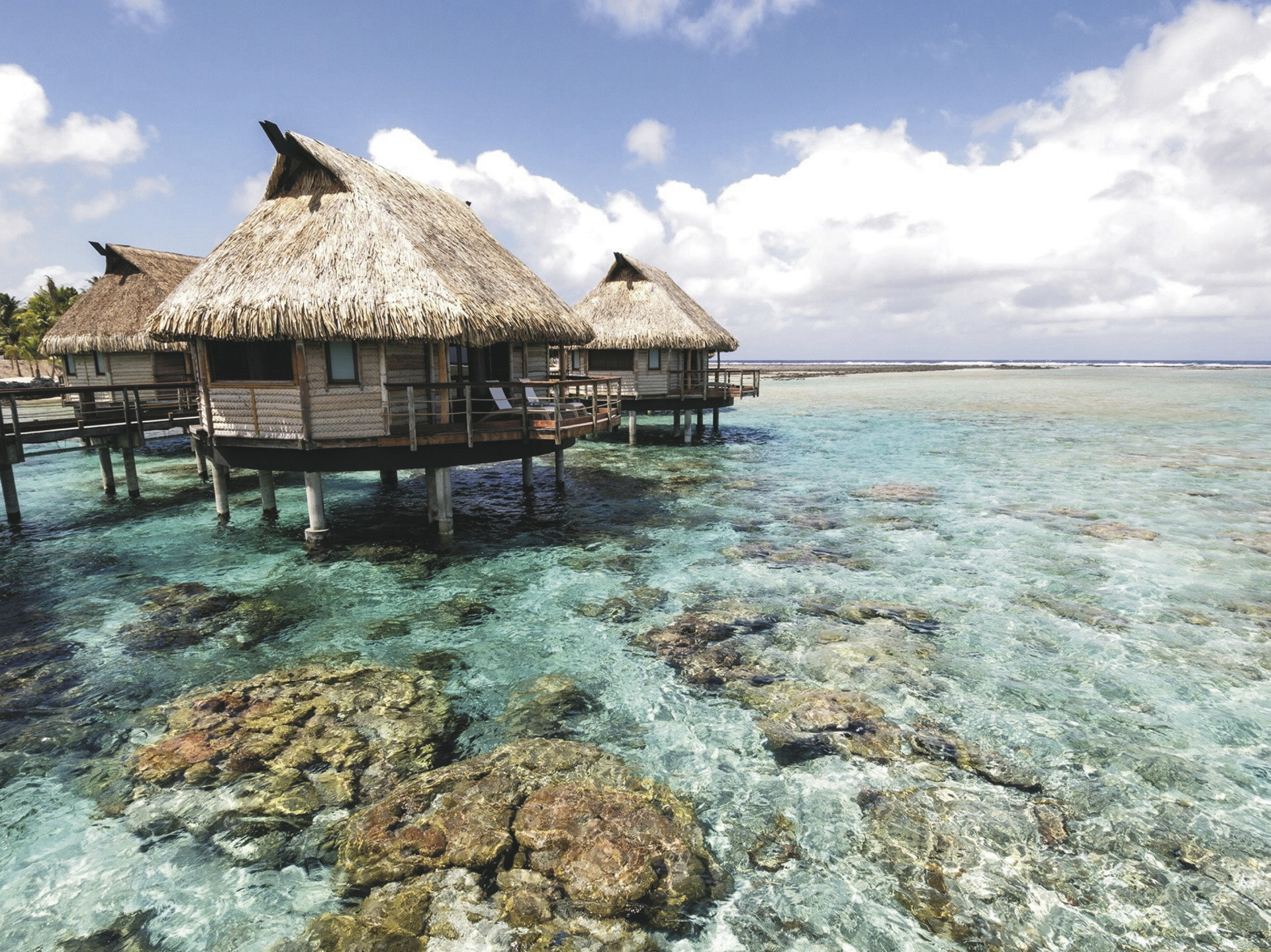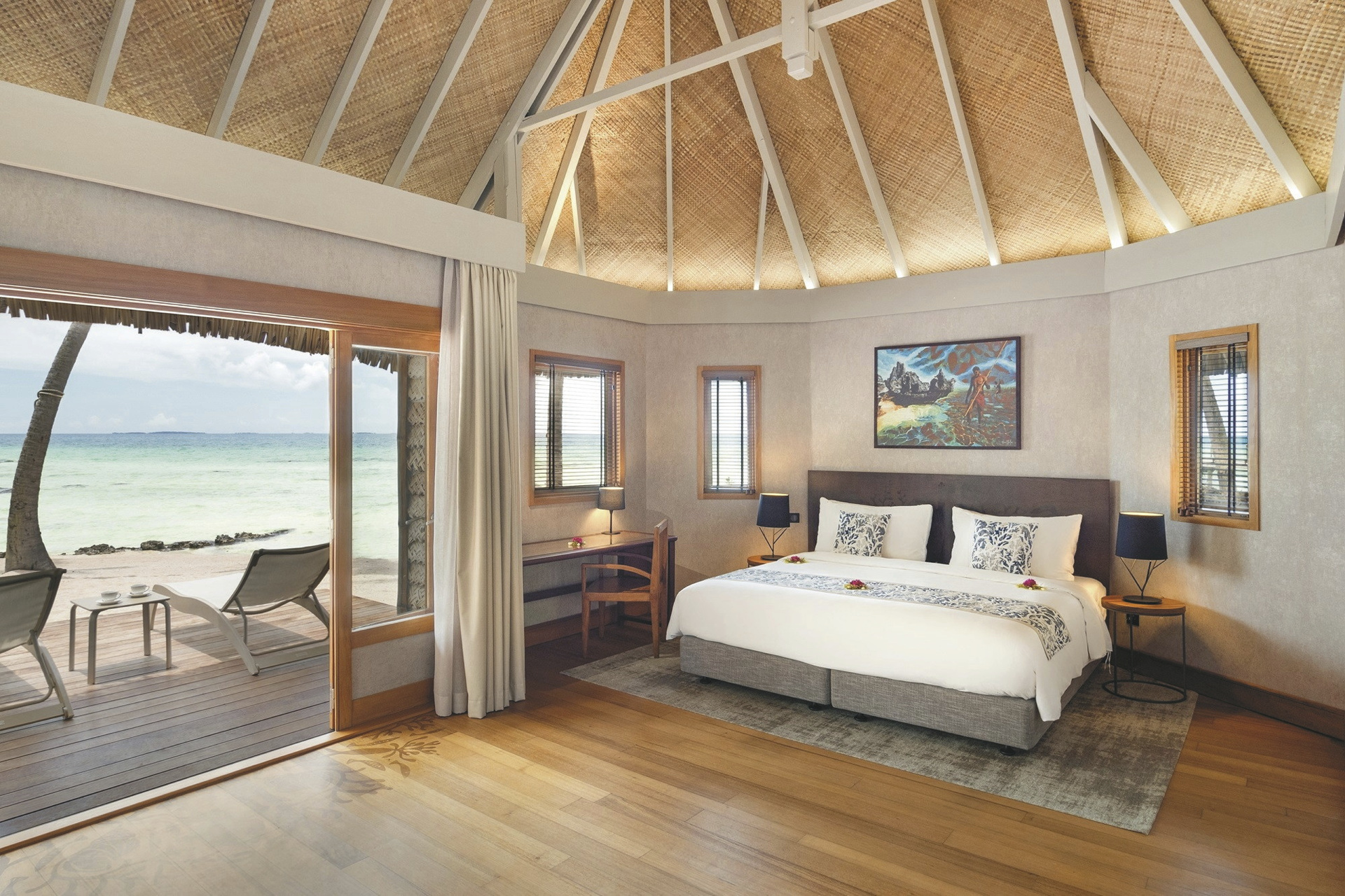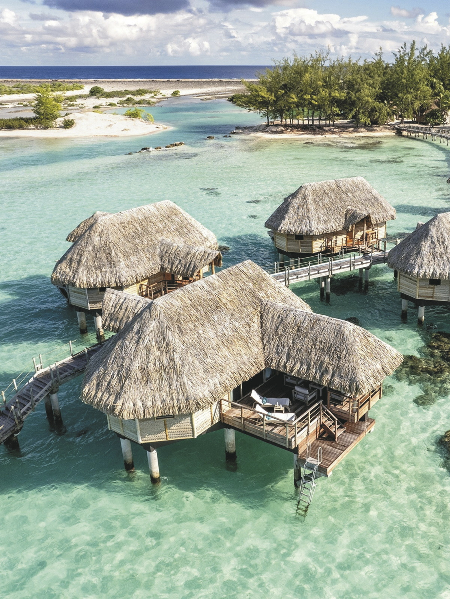 Alle 29 Bungalows sind im polynesischen Design gehalten und bieten gleichzeitig hohen Komfort und neueste Technik.Sie sind klimatisiert, verfügen über Terrasse mit Sonnenliegen, Minibar (täglich Nachschub), Nespresso Kaffeemaschine, Telefon, TV., Safe, Bügeleisen, ein luxuriöses Badezimmer mit Dusche. Durch das Glasfenster im Boden der Overwater-Bungalows können Sie die bunten Fische in der Lagune beobachten. Premium Overwater-Bungalows bieten zusätzlich Zugang zum Meer. Overwater-Suiten bieten viel Platz und im Bad zusätzlich eine Badewanne.
